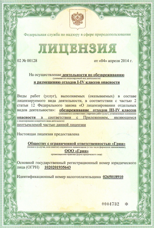 ООО «Грин» получена новая лицензия на утилизацию отходов I-IV классов опасности (серия 02 №00128 от 04.04.2014).