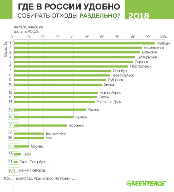 Лидером рейтинга 2.0 стали подмосковные Мытищи. Доступ к придомовому раздельному сбору там имеют 93% горожан. В первую пятёрку вошли Альметьевск (86%), Волжский (84%), Октябрьский (81%) и Саранск (80%). Москва оказалась на 52-ой строчке рейтинга: в столице лишь 11% горожан могут пользоваться контейнерами для раздельного сбора рядом с домом. Петербург занял 91-е место, так как по официальным данным, баки для вторсырья стоят во дворах только 2% жителей.